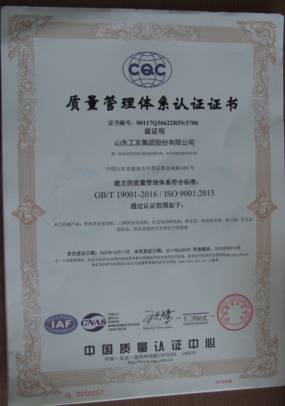 8月15日,公司收到了中國質(zhì)量認證中心頒發(fā)的新版標準證書。至此,2017年體系換版換證的工作圓滿結束。